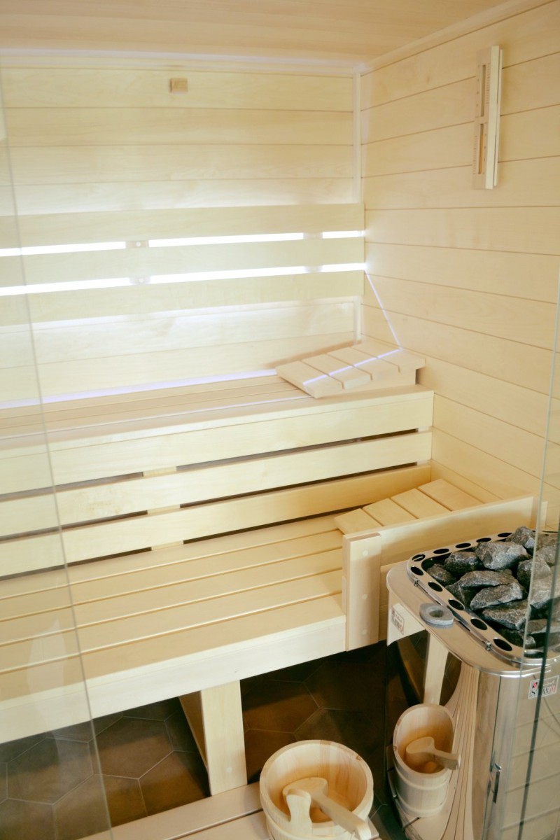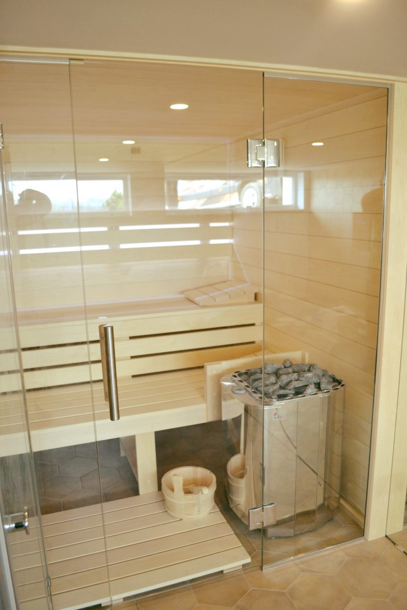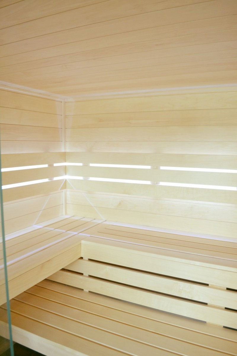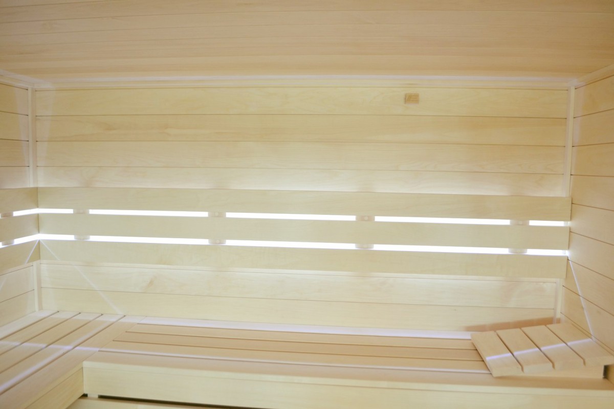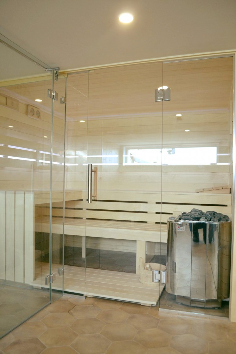 Bezprogowy front sauny wykonany ze szkła o grubości 8mm. Grubość hartowanego szkła ma bardzo duże znaczenie, ponieważ właśnie ten czynnik odpowiada za czas nagrzewania kabiny oraz zużycie prądu.